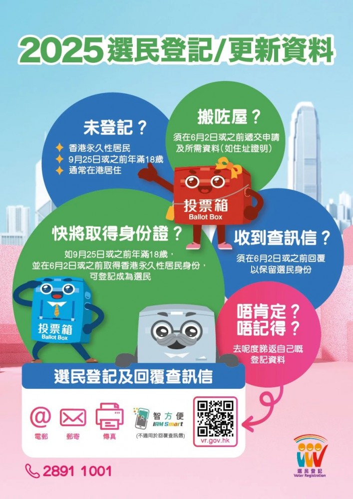 日期 : 2025-04-29香港特區政府選舉事務處呼籲合資格的個人或團體,如尚未登記為地方選區、功能界別及/或選舉委員會界別分組選民/投票人,儘早於法定限期6月2日或之前提交登記申請,其登記資料方可被納入今年發表的正式選民/投票人登記冊,並於今年舉行的選舉中投票。[换行符][换行符]凡持有身份證明文件、在今年9月25日或之前年滿18歲及通常在香港居住的香港永久性居民,均符合資格登記為地方選區選民。已登記的選民/投票人無須重新登記,但假如其住址或其他登記資料有任何變更,則同樣應於法定限期6月2日或之前向選舉事務處提交更改資料申請。